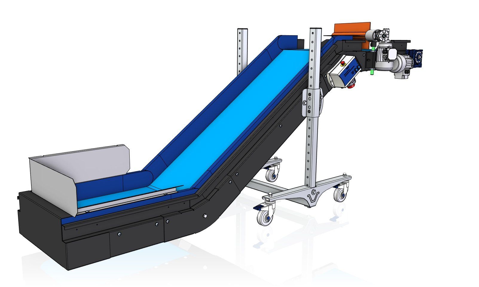La CB es una cinta transportadora inclinada estándar, muy utilizada en inyección de plásticos para evacuar piezas o coladas desde la máquina hacia cajas, mesas o sistemas posteriores.