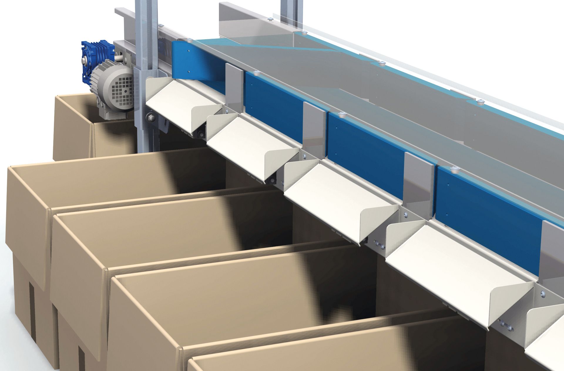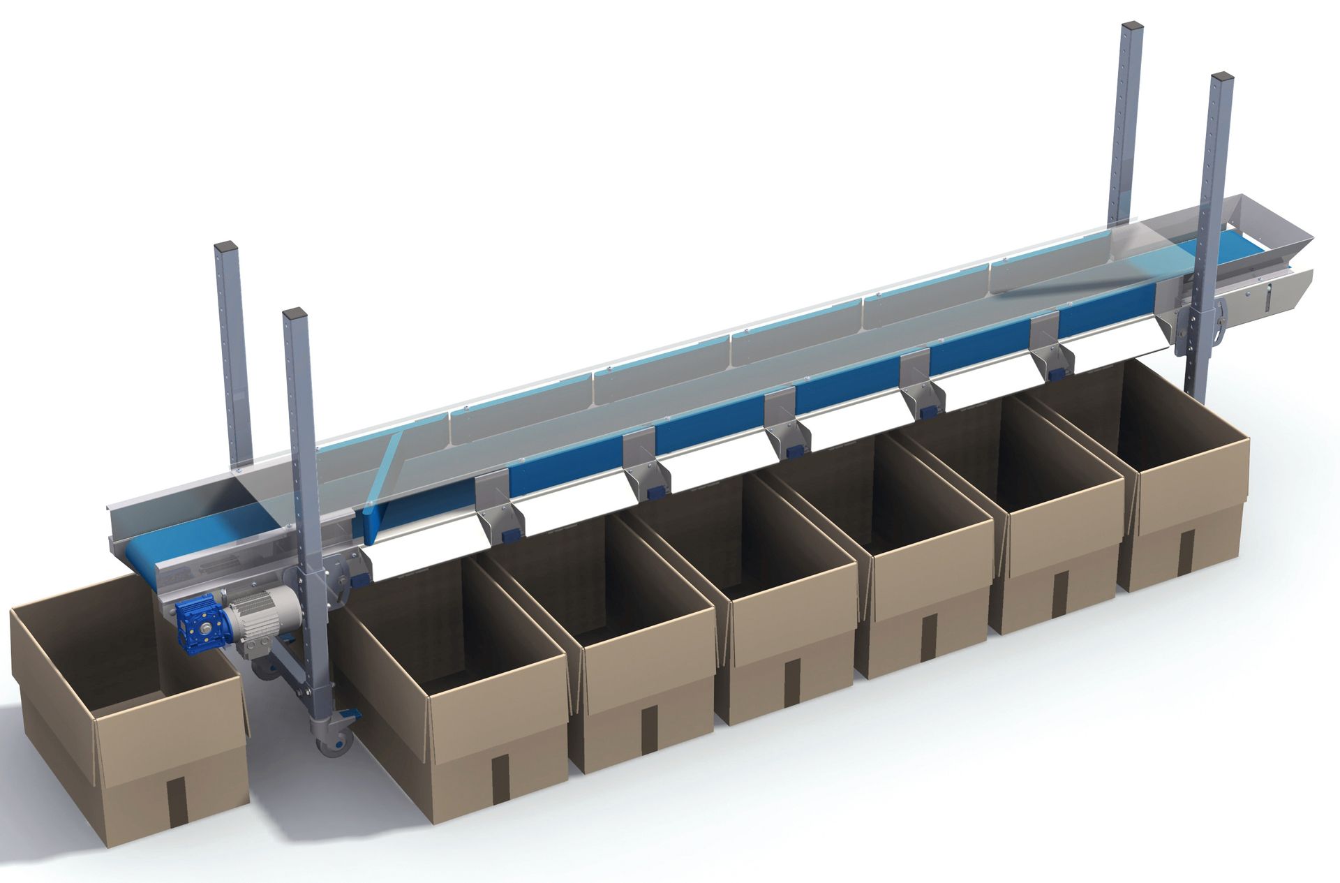 - Transporte continuo a cajas, mesas o cintas posteriores